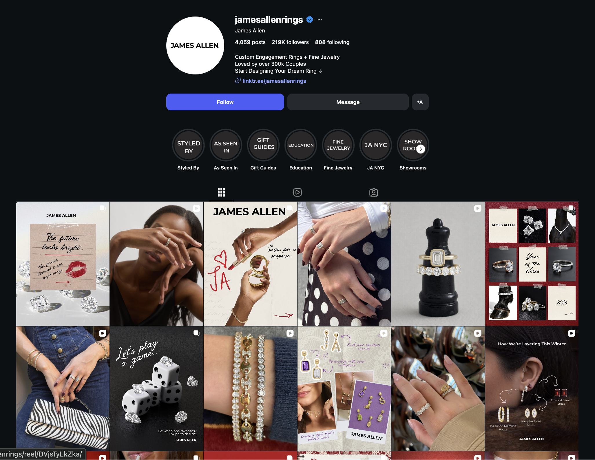 James Allen’s style of marketing and product presentation is different. They sometimes use GIF-like videos, not the usual minimalist aesthetic, but more detailed and artistic, presenting the jewelry with a creative, art-driven approach. They’re also consistent in aligning their marketing with calendar events and holidays to stay relevant and appealing to their audience.