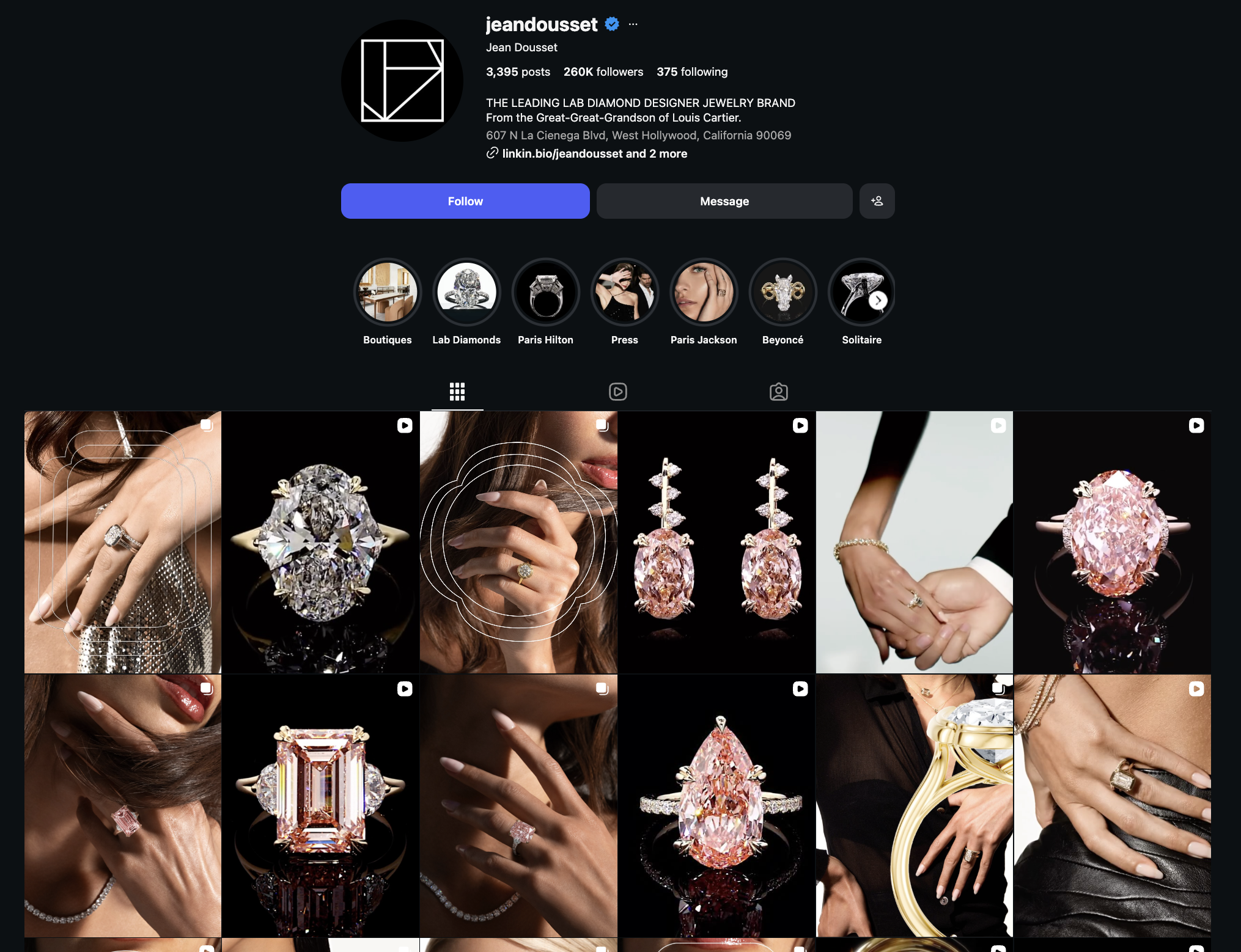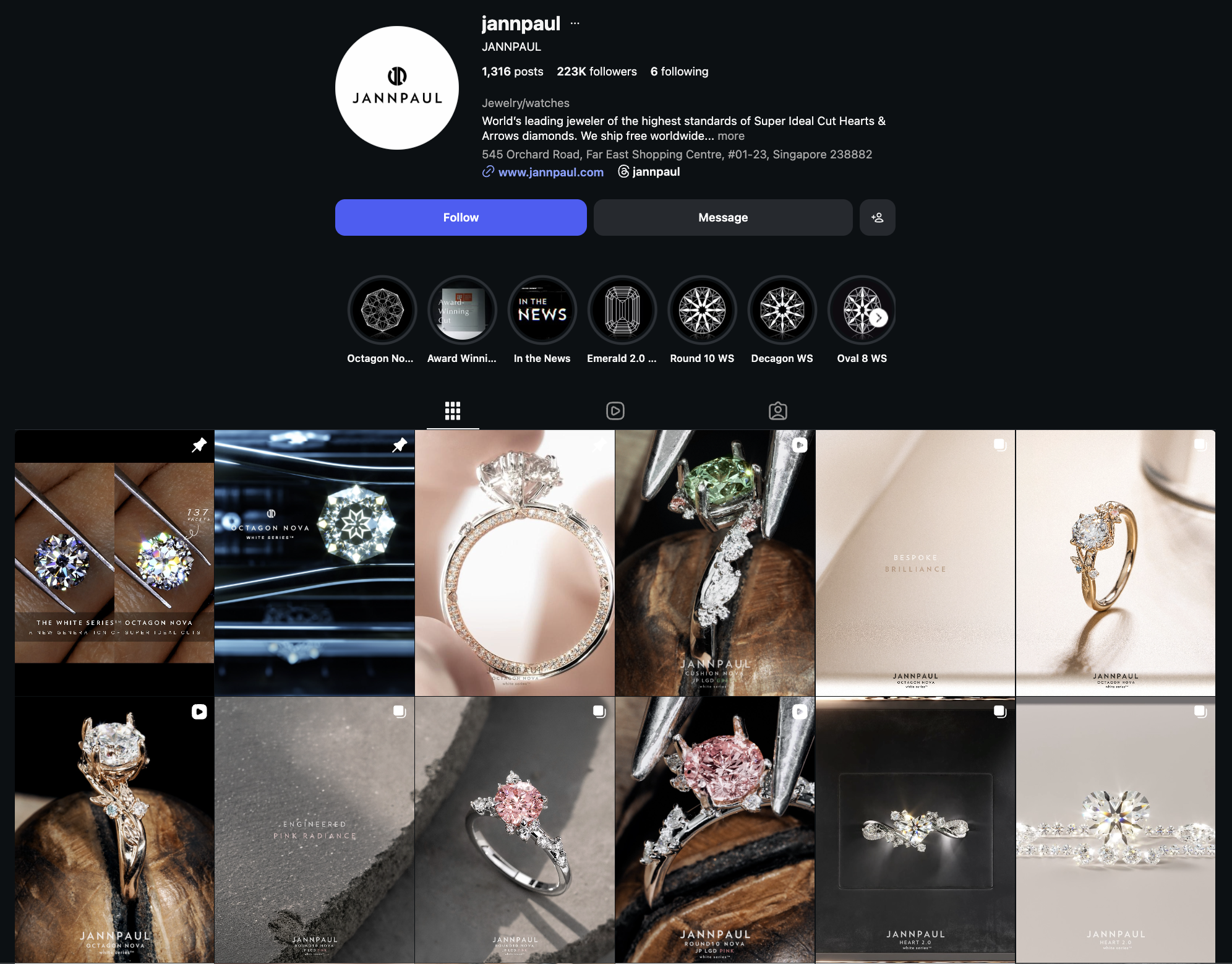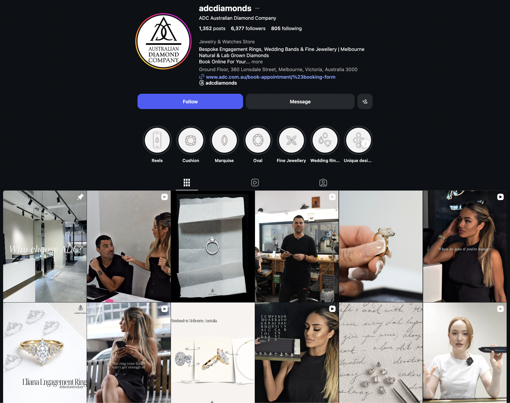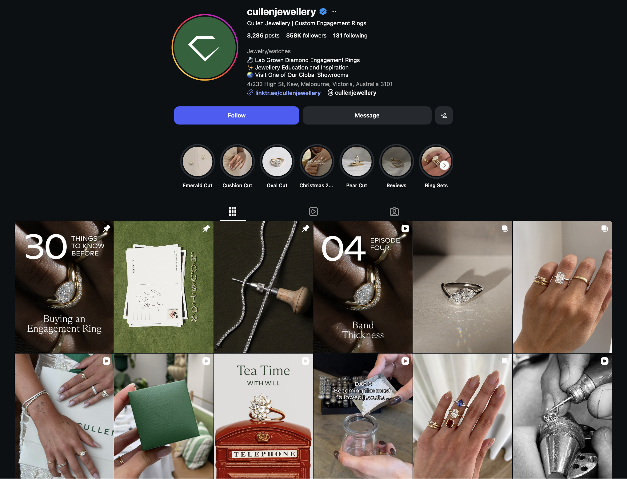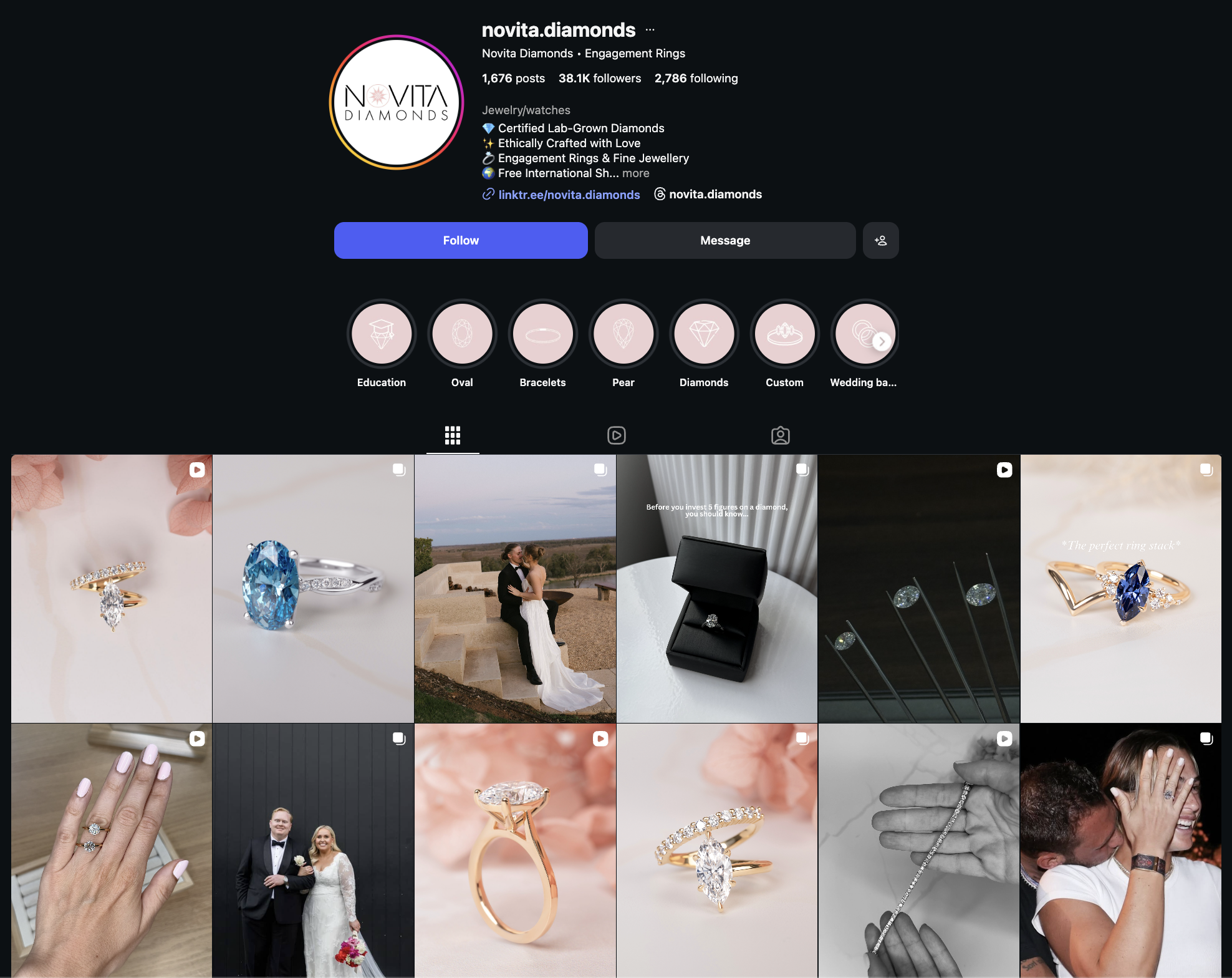 And when you look at their timeline, most posts have clean, aesthetic reel covers. Their reels are often part of a series, featuring different diamond sizes, unique shapes, or educational facts about them. And I think their reels are also synced with their TikTok account, using the same content across both platforms.
