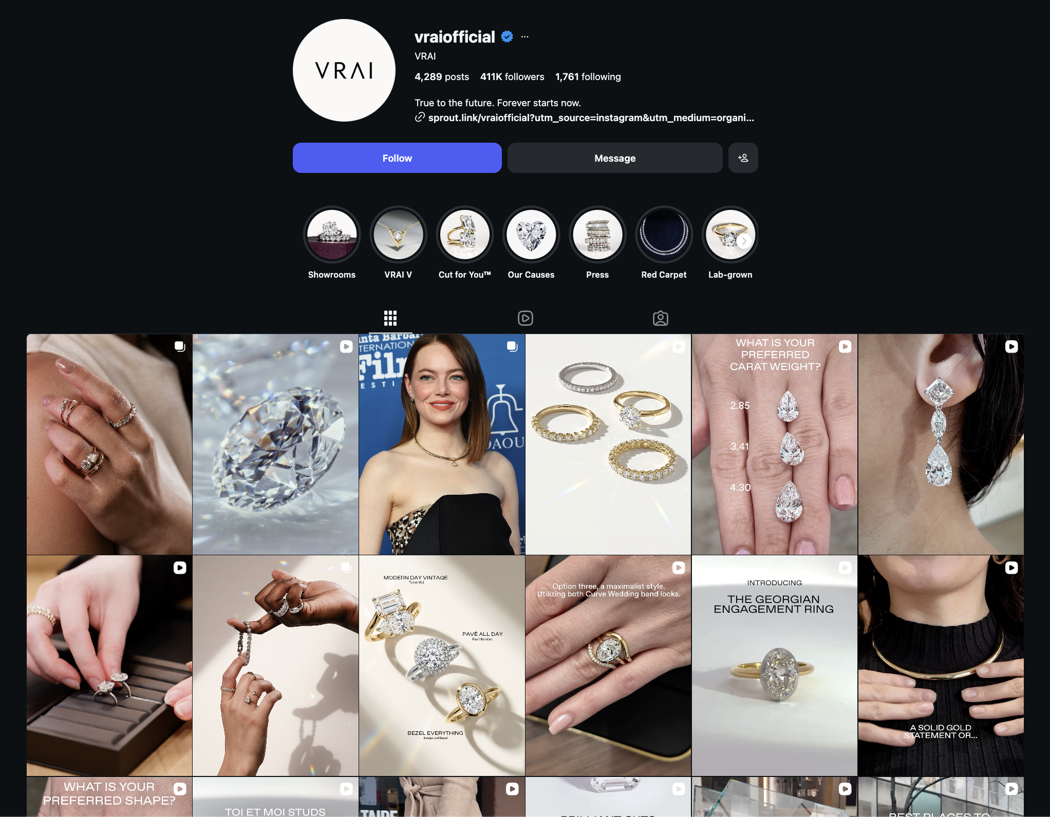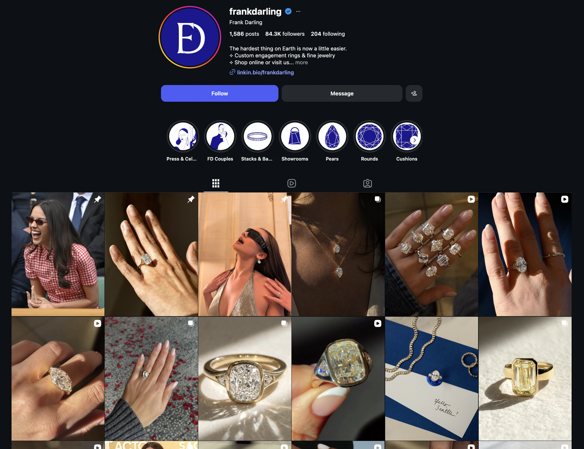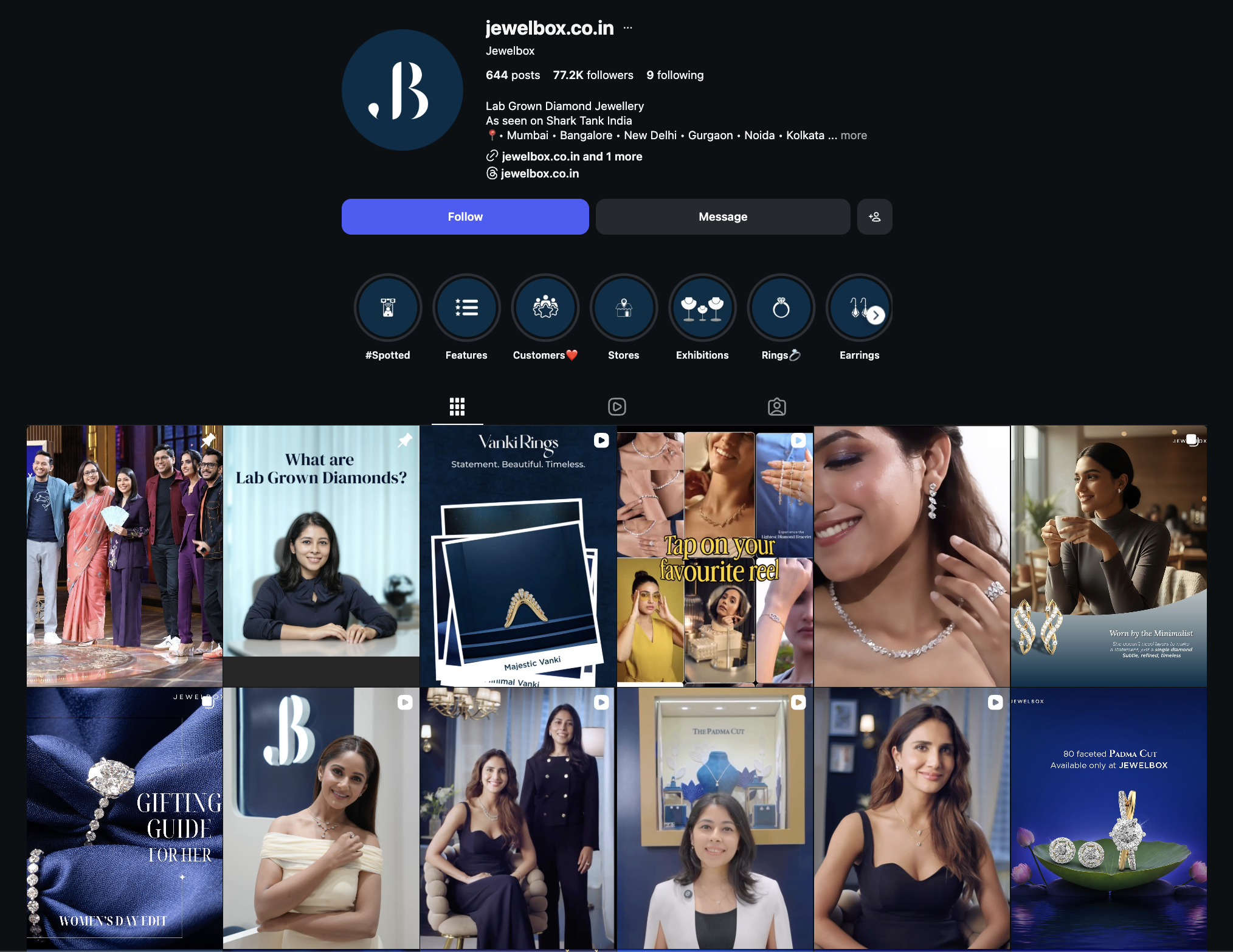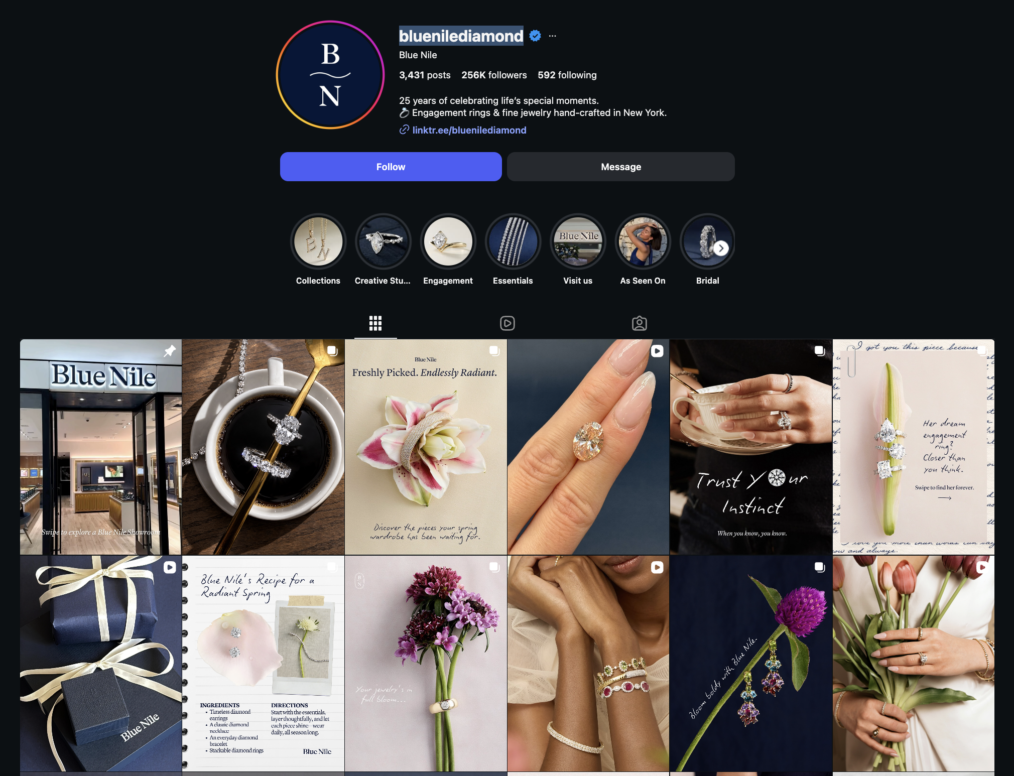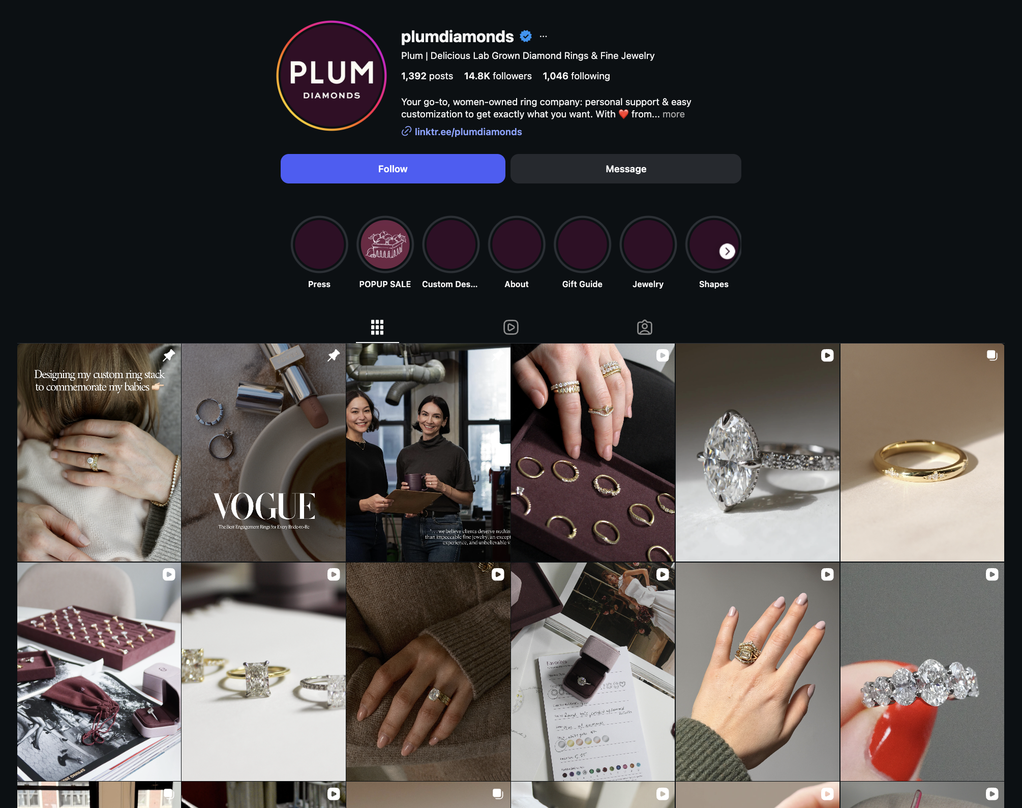 And when you look at their timeline, most posts have clean, aesthetic reel covers. Their reels are often part of a series, featuring different diamond sizes, unique shapes, or educational facts about them. And I think their reels are also synced with their TikTok account, using the same content across both platforms.