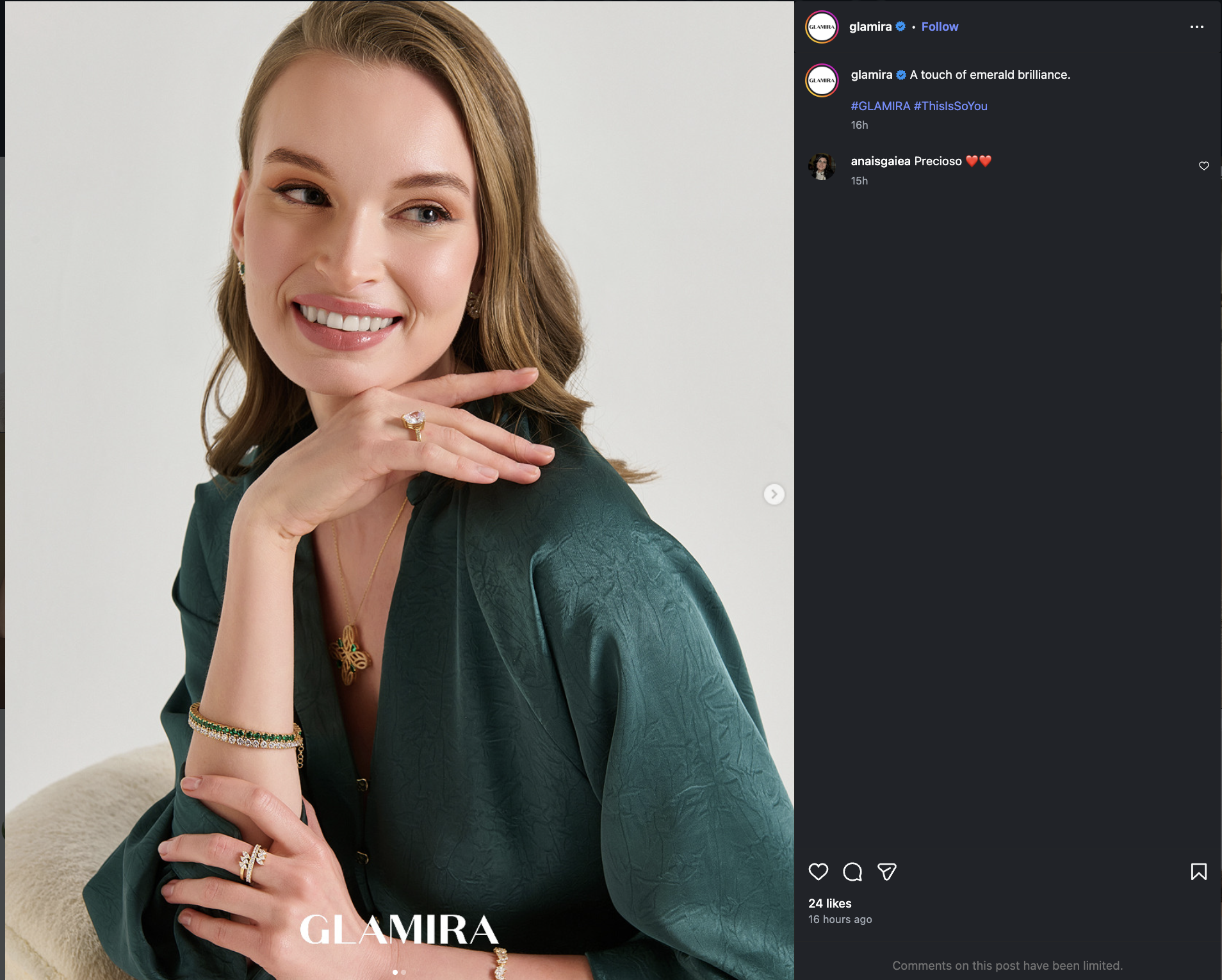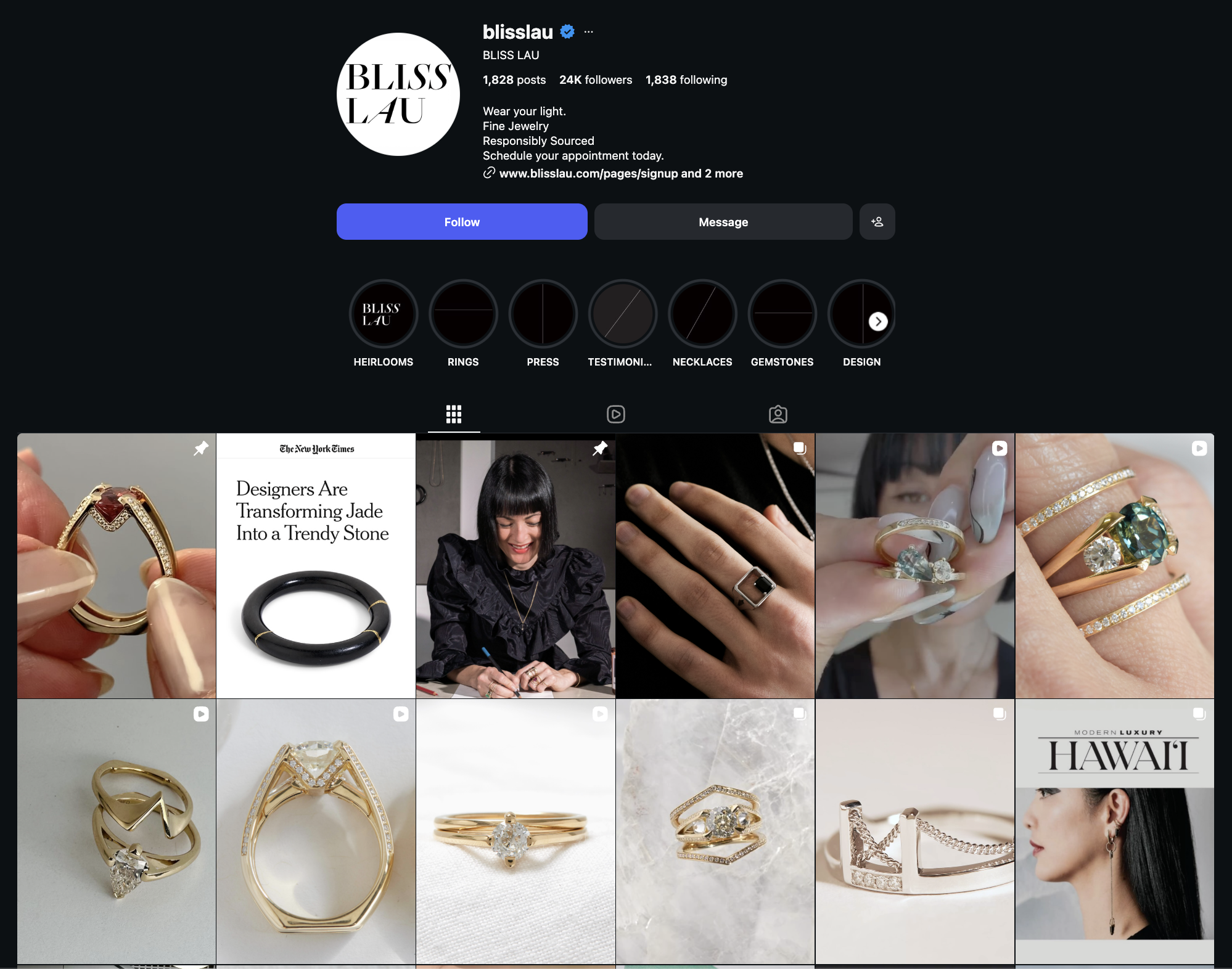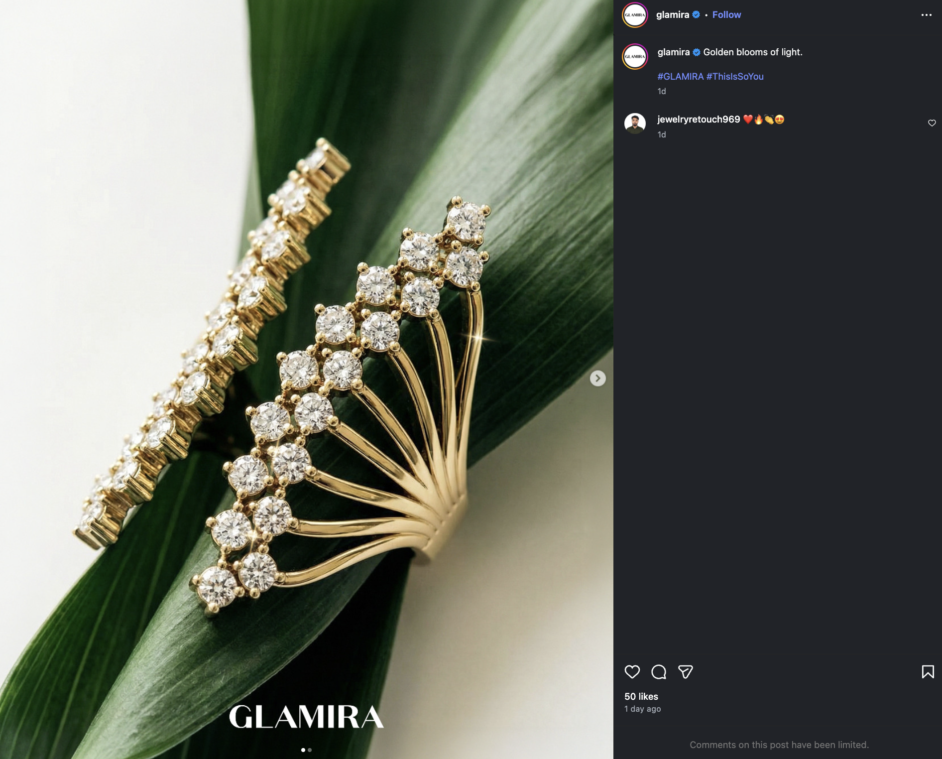 They usually present the product with a close-up shot of the jewelry, paired with a simple caption and minimal hashtags.