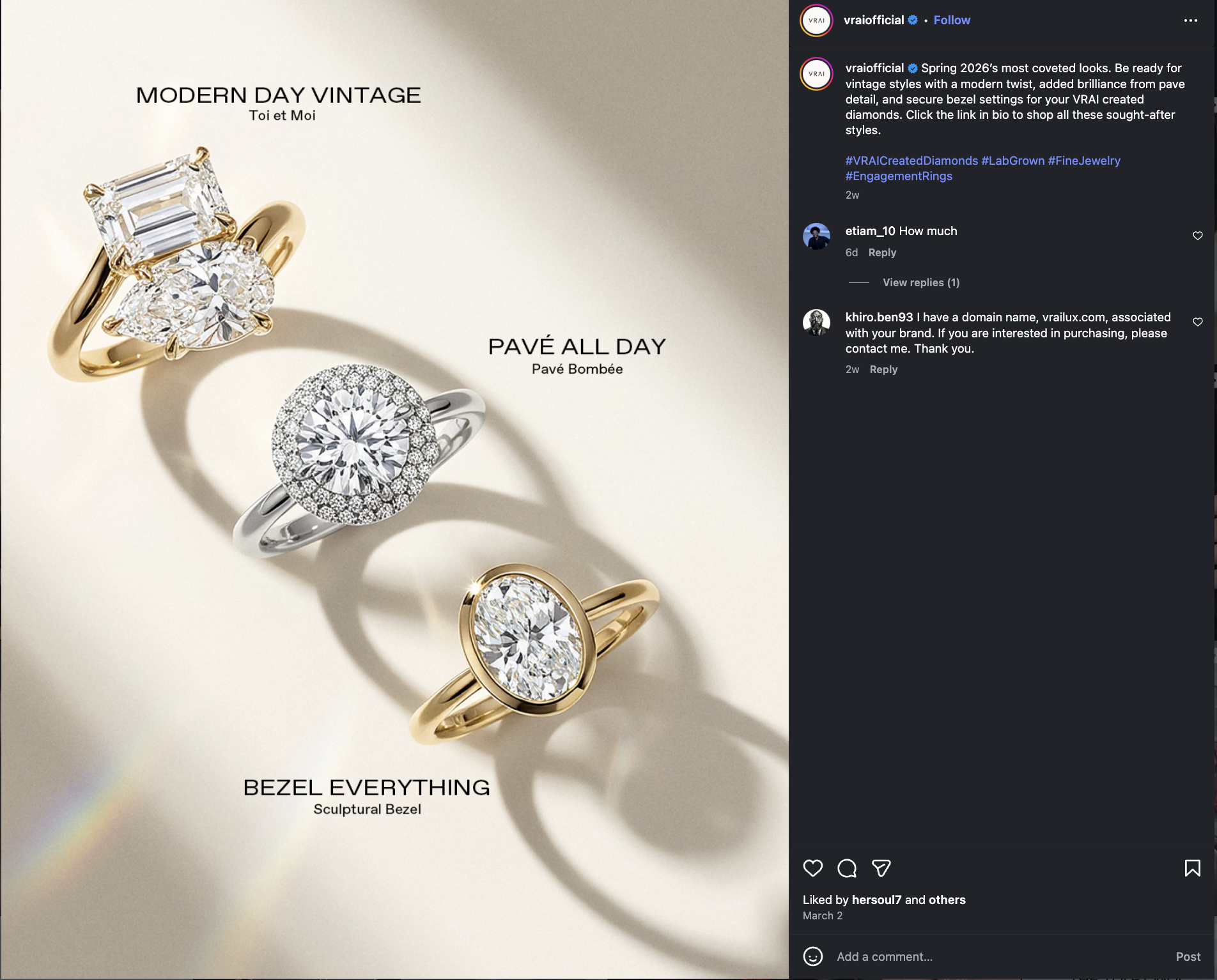 Their content sometimes highlights trending diamond shapes, like pear-shaped designs. They also share videos of trying on rings or mockups on fingers, helping buyers visualize their options and see what suits them best. https://www.instagram.com/p/DVt9Hs8CN2K/